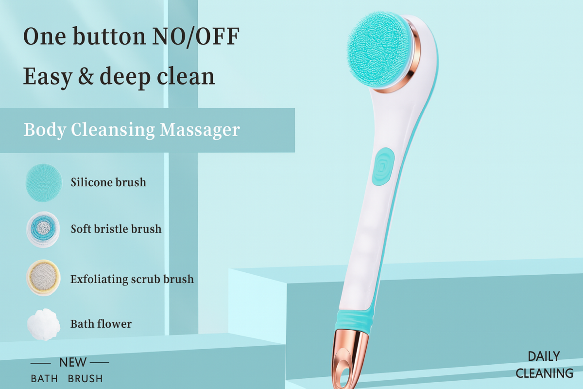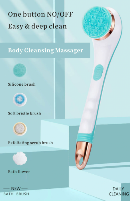 Компактна и мощна електрическа четка за тяло с дълга дръжка, за лесно достигане и ефективно почистване, ексфолиране и масаж – водоустойчива и практична за ежедневна употреба.