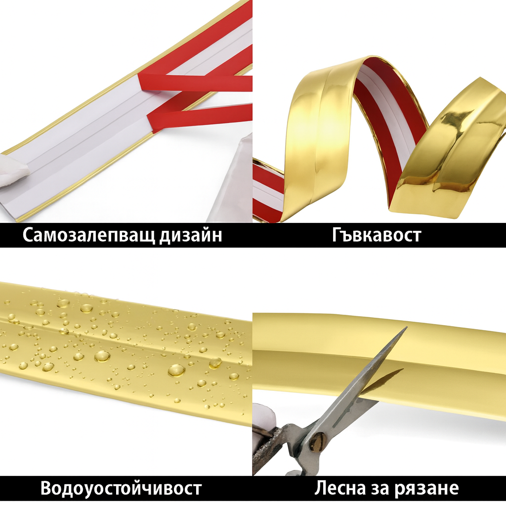 Декоративната самозалепваща лайсна е изработена от висококачествен PVC/PET материал с метализиран гланц и силно лепило.