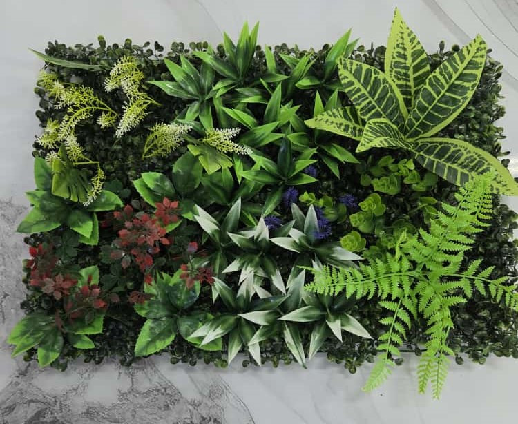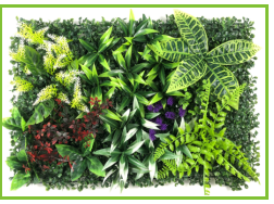 Това декоративно зелено пано 40×60 см комбинира различни текстури, листни форми и цветни акценти, които създават ефектна и жива визия. Подходящо е за освежаване на интериорни пространства, фотокътове, стени зад рецепции и акцентни зони в дома или офиса. Паното изглежда обемно и естествено, без нужда от грижи.