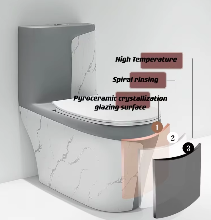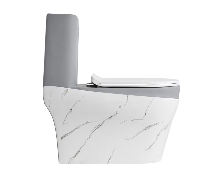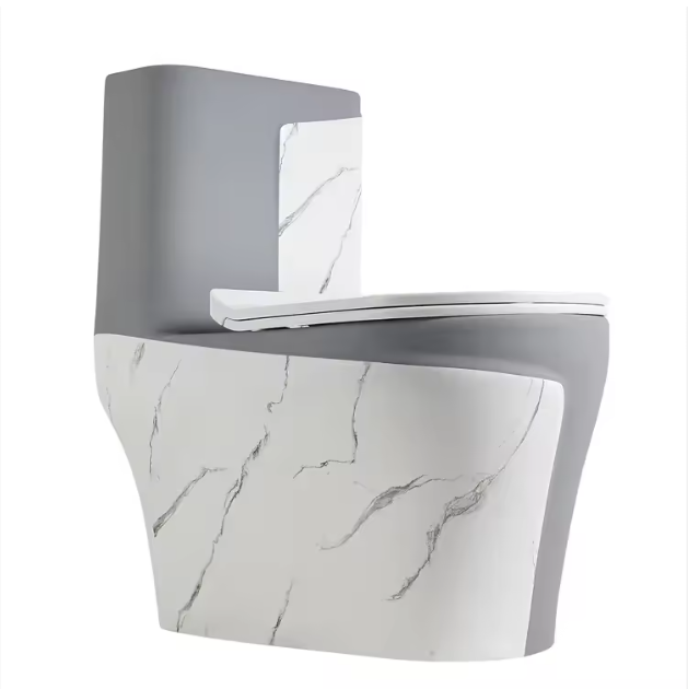 Този моноблок съчетава функционалност и елегантност в един цялостен корпус от санитарна керамика с изящен сив мраморен ефект. Формата е класическа, но изключителната декоративна фурнирка го прави истински визуален акцент.