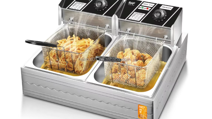 С двойния дълбок фритюрник RAF R5221 получавате общ капацитет от 11 литра и мощност 5000W – идеален за семейни празници и малки заведения. Два отделни съда ви позволяват да приготвяте различни ястия едновременно, с гаранция за перфектен вкус и хрупкавост.