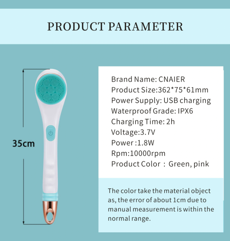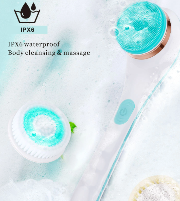 Компактна и мощна електрическа четка за тяло с дълга дръжка, за лесно достигане и ефективно почистване, ексфолиране и масаж – водоустойчива и практична за ежедневна употреба.