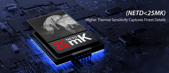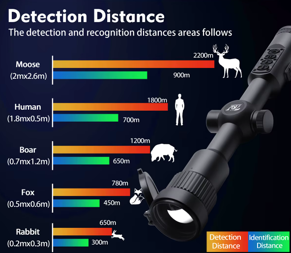 Благодарение на високочувствителния инфрачервен сензор и широкия обектив от 50 mm, устройството предоставя ясна картина с обхват до 1400 m за хора и над 2500 m за автомобили.