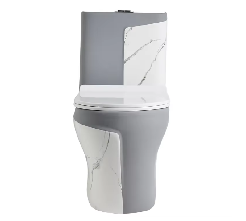 Този моноблок съчетава функционалност и елегантност в един цялостен корпус от санитарна керамика с изящен сив мраморен ефект. Формата е класическа, но изключителната декоративна фурнирка го прави истински визуален акцент.