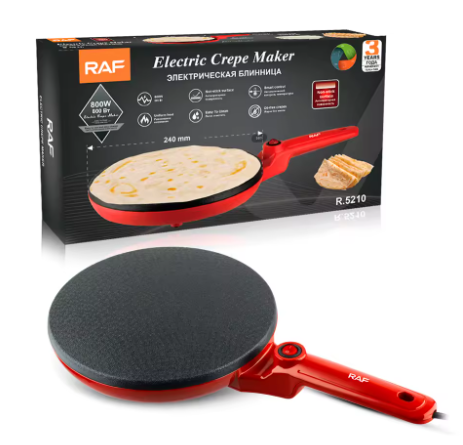 Приготви любимите палачинки бързо и лесно с RAF R-5210 – електрически уред за палачинки. Компактният и удобен дизайн позволява да правиш равномерни, златисти палачинки без излишно омазняване и без загаряне. Само загряваш, сипваш тесто и за минути имаш готови вкусотии за цялото семейство.