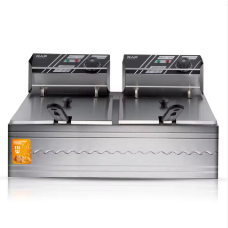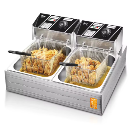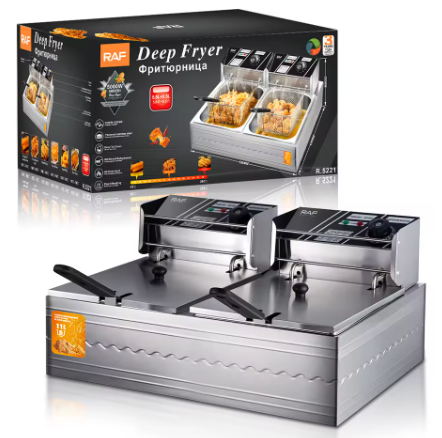 С двойния дълбок фритюрник RAF R5221 получавате общ капацитет от 11 литра и мощност 5000W – идеален за семейни празници и малки заведения. Два отделни съда ви позволяват да приготвяте различни ястия едновременно, с гаранция за перфектен вкус и хрупкавост.